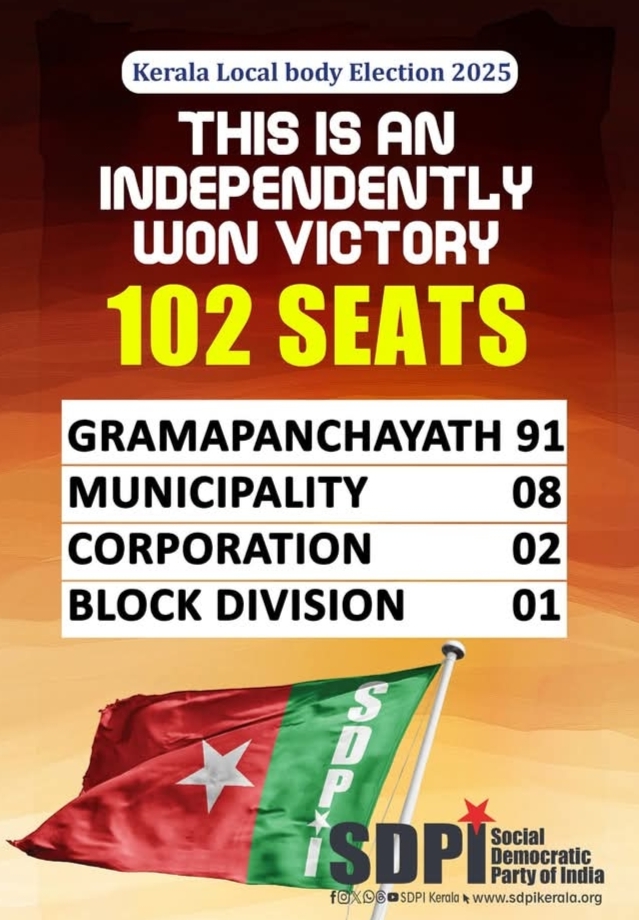 केरल के लोकल बॉडी चुनाव में जहाँ भाजपा और कांग्रेस जैसी बड़ी पार्टियाँ गठबंधन के साथ मैदान में थीं, वहीं सोशल डेमोक्रेटिक पार्टी ऑफ इंडिया (SDPI) ने अकेले दम पर चुनाव लड़ते हुए 102 सीटों पर ऐतिहासिक जीत दर्ज की है। इस पर देश भर में एसडीपीआई के कार्यकर्ता और पदाधिकारी खुशियां मना रहे हैं।