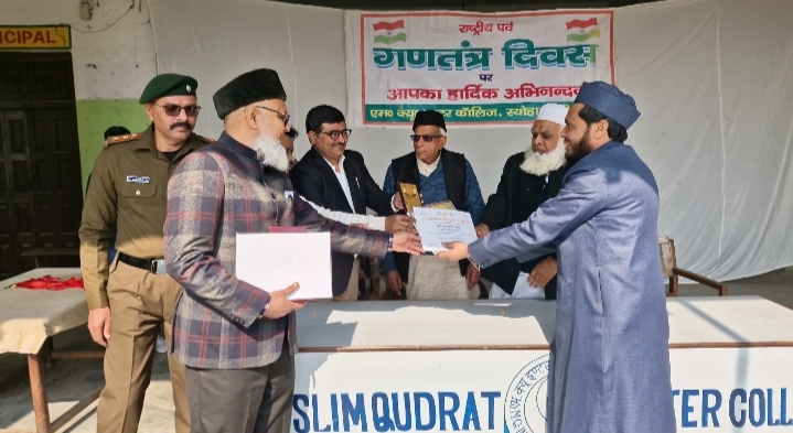 यहां के एम.क्यू.इंटर कॉलेज में गणतंत्र दिवस पर हुए प्रोग्राम में जहां प्रतिभाशाली छात्र छात्राओं की हौंसला अफ़ज़ाई की गई वहीं देश और समाज में एसआईआर, जनसेवा और शिक्षा में महत्वपूर्ण योगदान देने वाले अनेक लोगों को सम्मानित किया गया। इस समारोह की अध्यक्षता हाजी ज़की उर-रहमान एडवोकेट ने की और संचालन मोहम्मद नाज़िर उर्दू विभागाध्यक्ष ने किया। मुख्य अतिथि के रूप में मैनेजर वकील अहमद मौजूद रहे। प्रधानाचार्या मंसूर अली इशरत का योगदान सराहनीय रहा। उन्होंने छात्र-छात्राओं का हौंसला बढ़ाया और उन्हें पुरस्कृत किया। इस अवसर पर जहां वक्ताओं ने अपने विचार व्यक्त करके छात्र छात्राओं को गणतंत्र दिवस के प्रति जागरूक किया वहीं दूसरी ओर शिक्षा के महत्व को बताते हुए आगे बढ़ने का आव्हान किया। जिन जिन लोगों, लैक्चरर तथा अध्यापकों ने महत्वपूर्ण योगदान दिया उनको मुख्य अतिथि और विशिष्ट मेहमानों के द्वारा सम्मानित किया गया। फिजिक्स लैक्चरर मोहम्मद उस्मान को रोटरी क्लब द्वारा प्रदान किए एक्सीलेंस अवार्ड को मुख्य अतिथिगणों ने उन्हें सौंप कर सम्मानित किया। इसी तरह एसआईआर में लोगों की खिदमत करने के लिए उर्दू विभागाध्यक्ष मोहम्मद नाज़िर को आल इंडिया पत्रकार एकता एसोसिएशन की ओर से मिले सम्मान पत्र को उन्हें सौंप कर सम्मानित किया गया। ये सम्मान एमक्यू इंटर कॉलेज के मैनेजर और अन्य मुख्य व्यक्तियों द्वारा दिए गए। इसके अलावा एजुकेशन एक्सिलेंट अवार्ड प्रदान किए गए। इस अवसर पर एनसीसी के कैप्टन मोहम्मद यूनुस चौधरी ने अपने विचार व्यक्त करते हुए सभी विद्यार्थियों की हौंसला अफ़ज़ाई की। मास्टर फ़हीम अहमद सिद्दीकी लैक्चरर अंग्रेज़ी ने छात्र छात्राओं को गणतंत्र दिवस की जानकारी दी। इसी मौके पर शेख साफिया ने अपनी उर्दू में तकरीर पेश की। जबकि सामिया अंसारी ने अंग्रेज़ी में स्पीच दी। रज़िया सुल्तान ने हिंदी में भाषण दिया। एनसीसी कैडेट्स ने राष्ट्रगान पेश किया। झंडा सलामी दी। कालेज के मैनेजर वकील अहमद ने छात्र छात्राओं को आगे बढ़ने के लिए शिक्षा के क्षेत्र में आगे बढ़ते रहने का आव्हान किया। इस अवसर पर उबैद अख़्तर, अतहर जमाल,ज़ैड आलम,माशूक अली, उवैस मतलूब,राशिद अहमद, पीटीआई मोहम्मद इकबाल हुसैन,अब्दुर रहमान, मोहम्मद आदिल, मोहम्मद सैफ, नागेन्द्र कुमार,पिंटू कुमार, मोहम्मद फारूक, इखलास अहमद,नवेद फारूक,आदि मौजूद रहे।